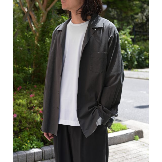 チャコールのシャツは、黒と馴染みながらもわずかに輪郭を際立たせてくれます。