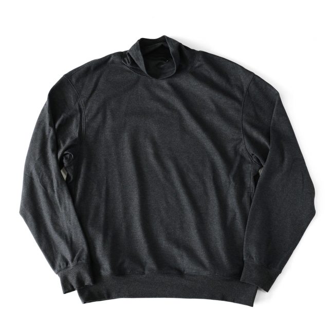 首元は前下がりにほどよいゆとりをつくるハイネックデザイン。