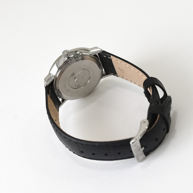 丸形の36㎜のワンピースケースにシルバー文字盤にバーインデクスで飽きのこないデザイン。
