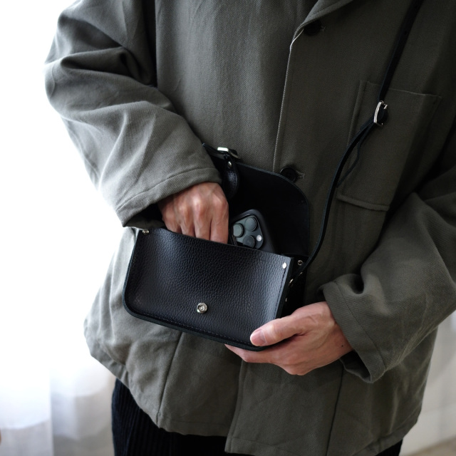スマートフォンと二つ折り財布、イヤホンケースが収まるサイズ感。