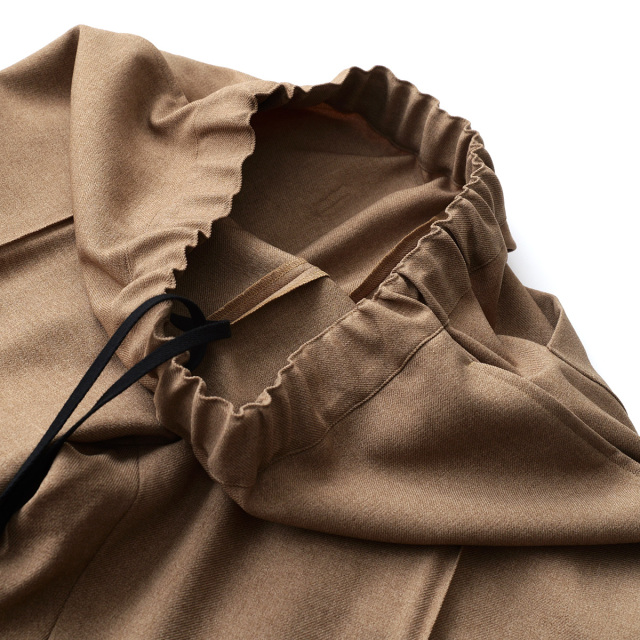 上品でウールライクな表情の中肉ストレッチポリエステルジャージー生地を使用。