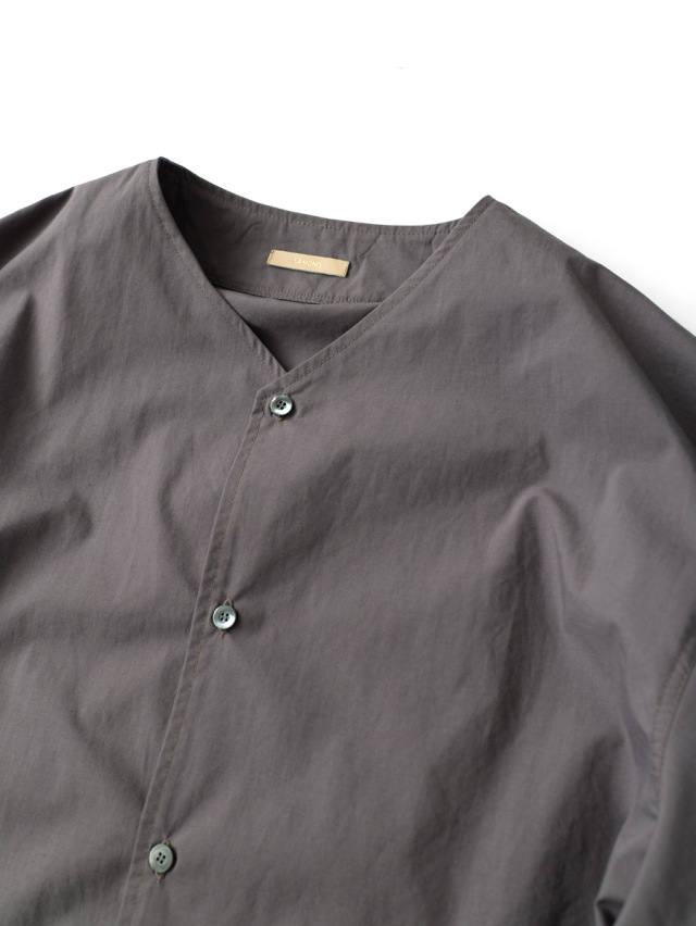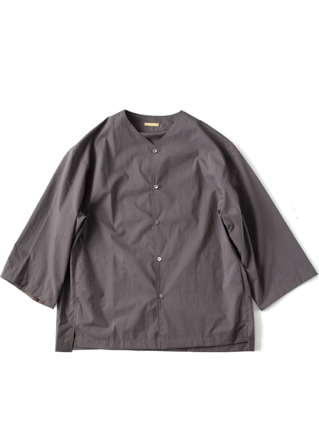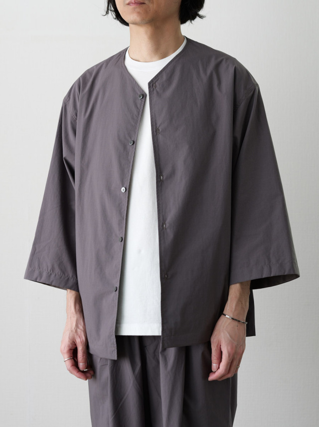 8分袖ノーカラーシャツジャケット。
