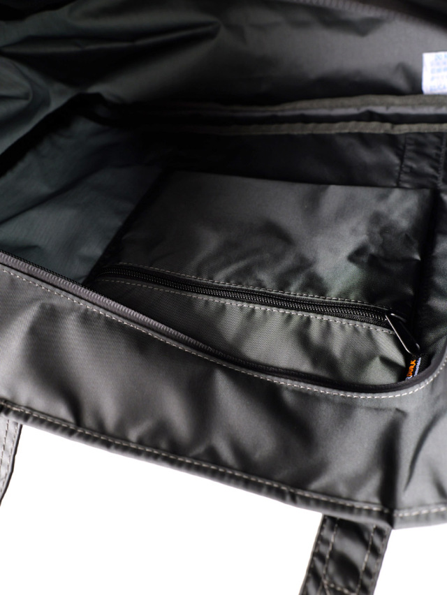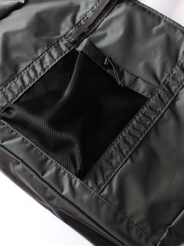 外側にメッシュの小ポケット、内部に小ポケット付。開閉口はファスナー仕様。