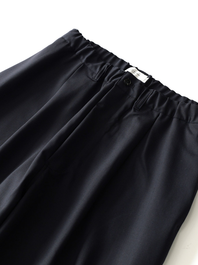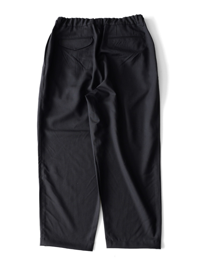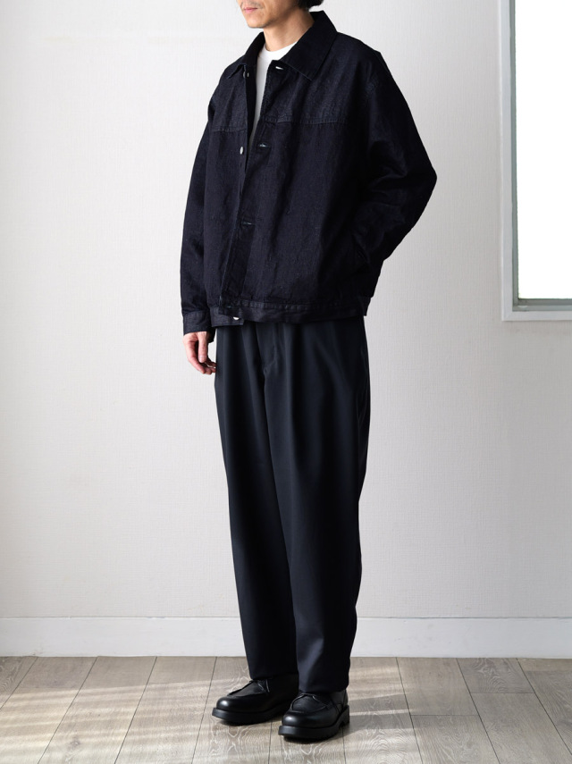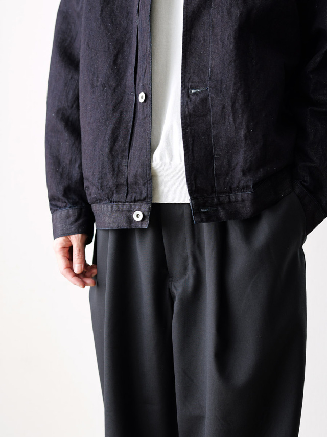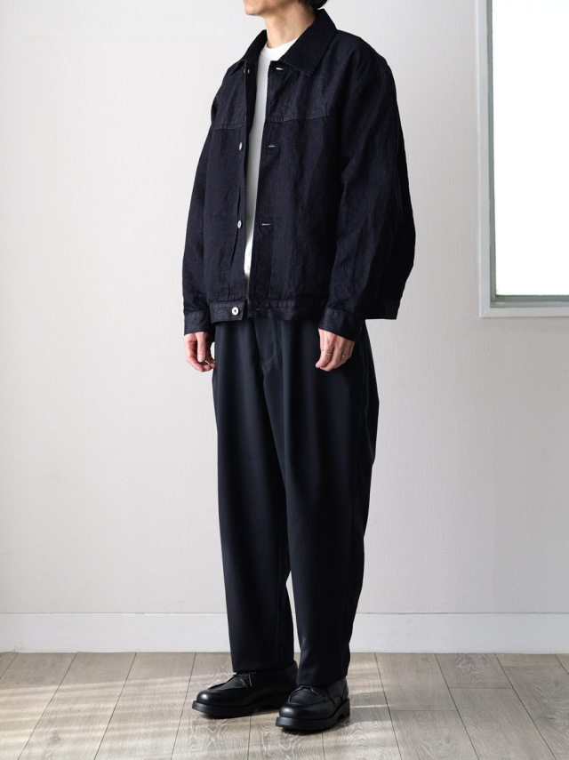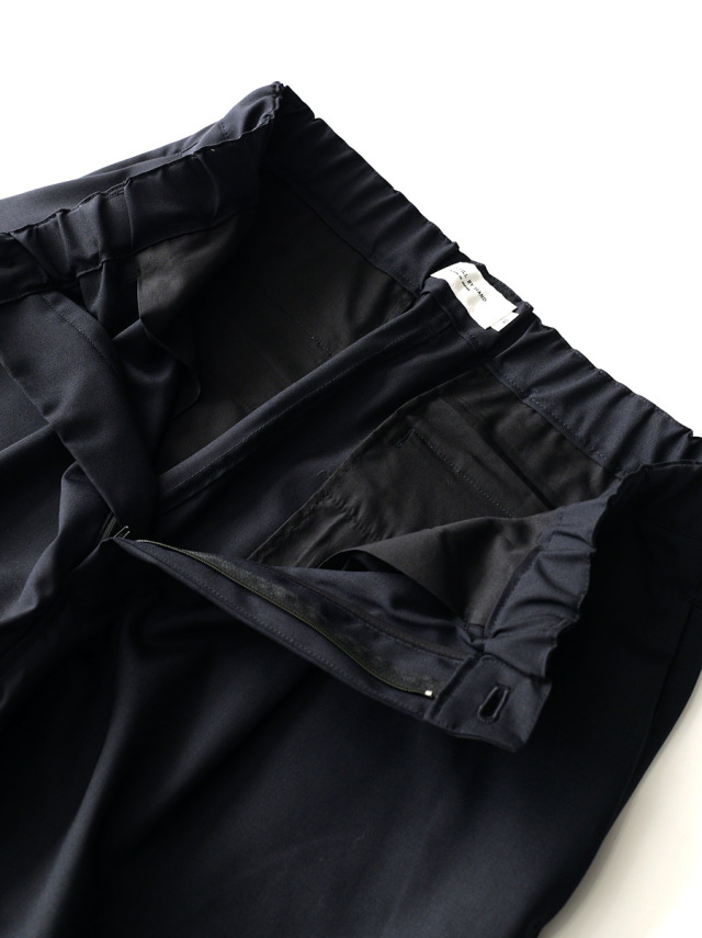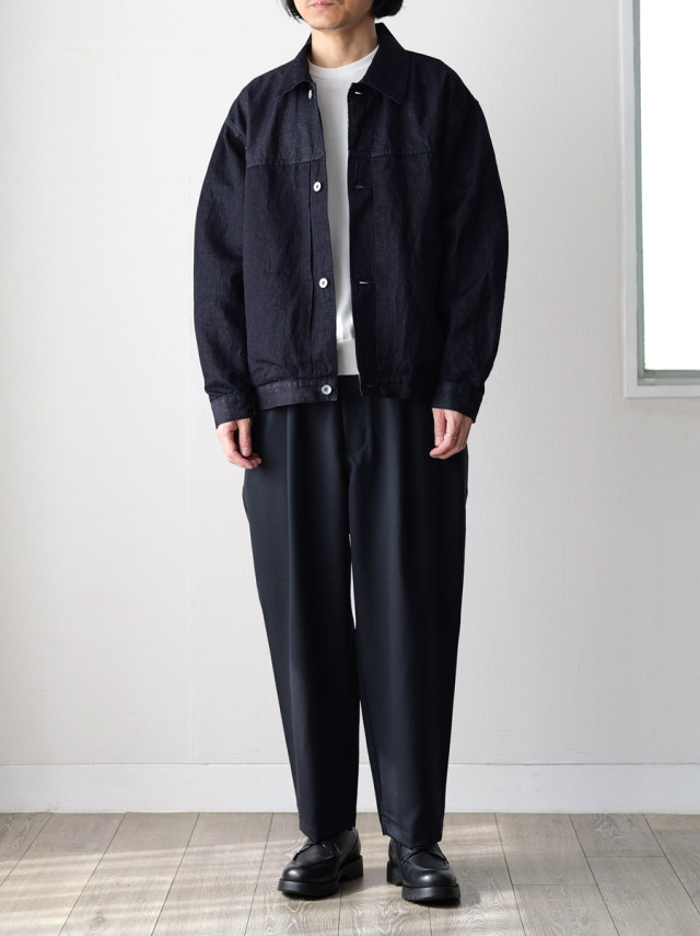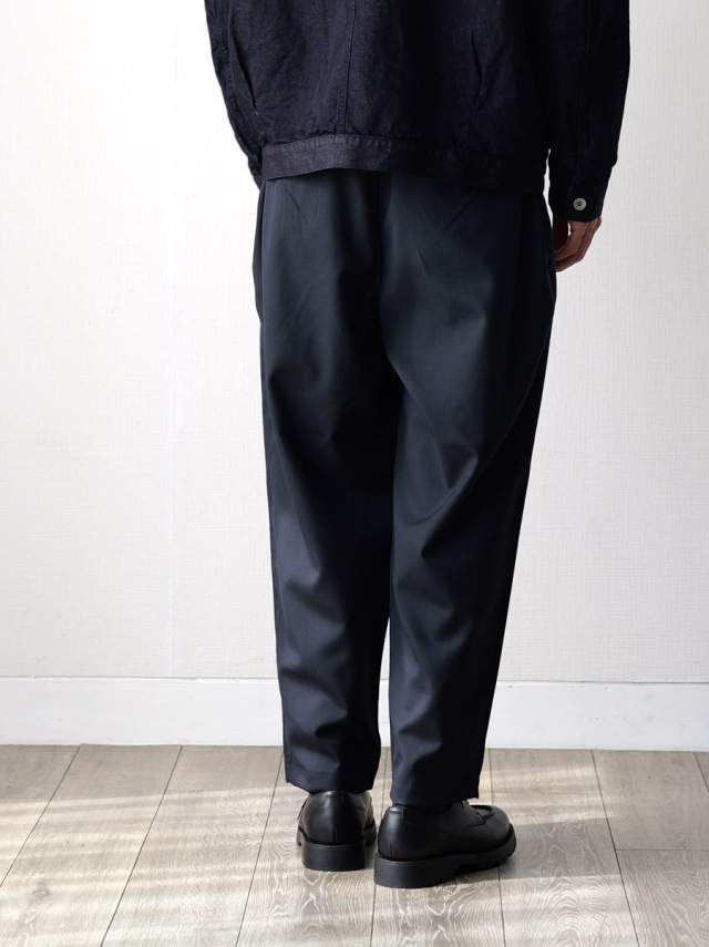 深めの股上とタックでわたりにしっかりとゆとりを持たせ足元はテーパードシルエット。