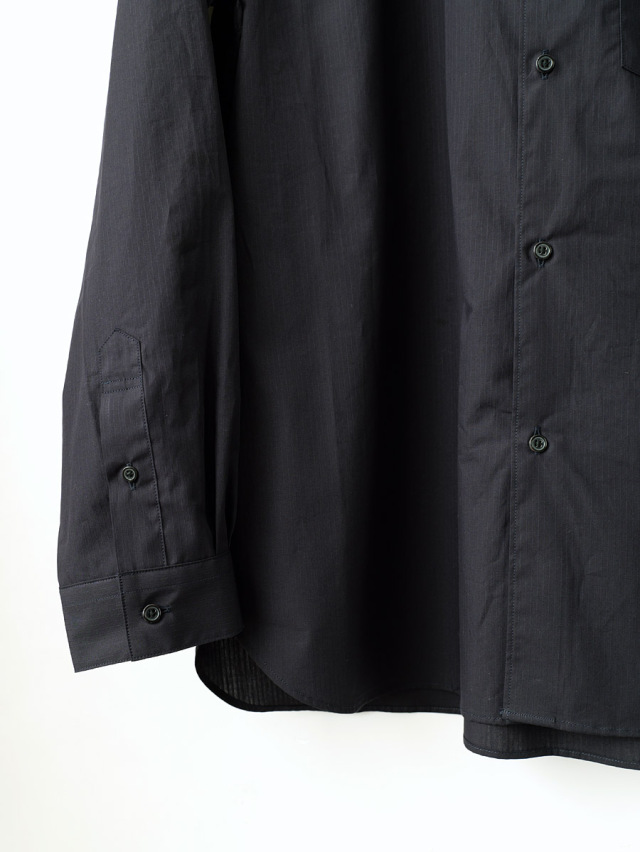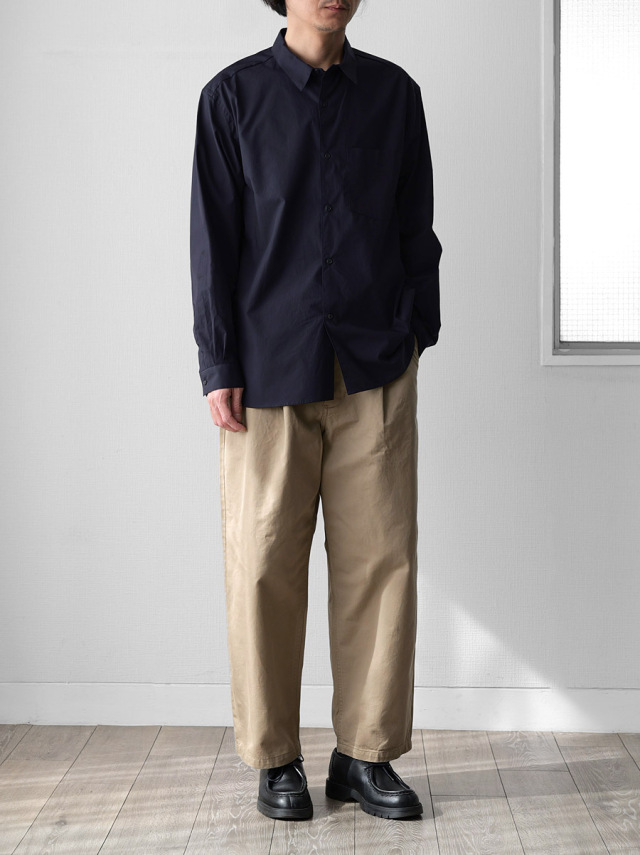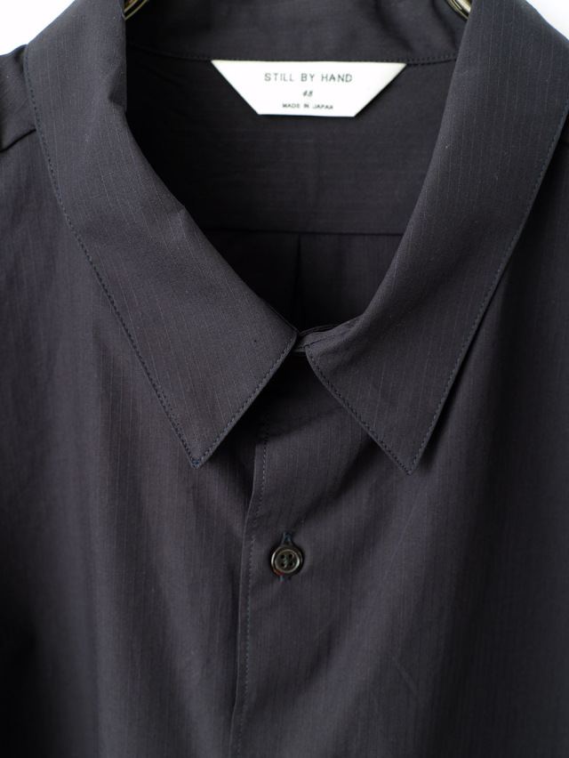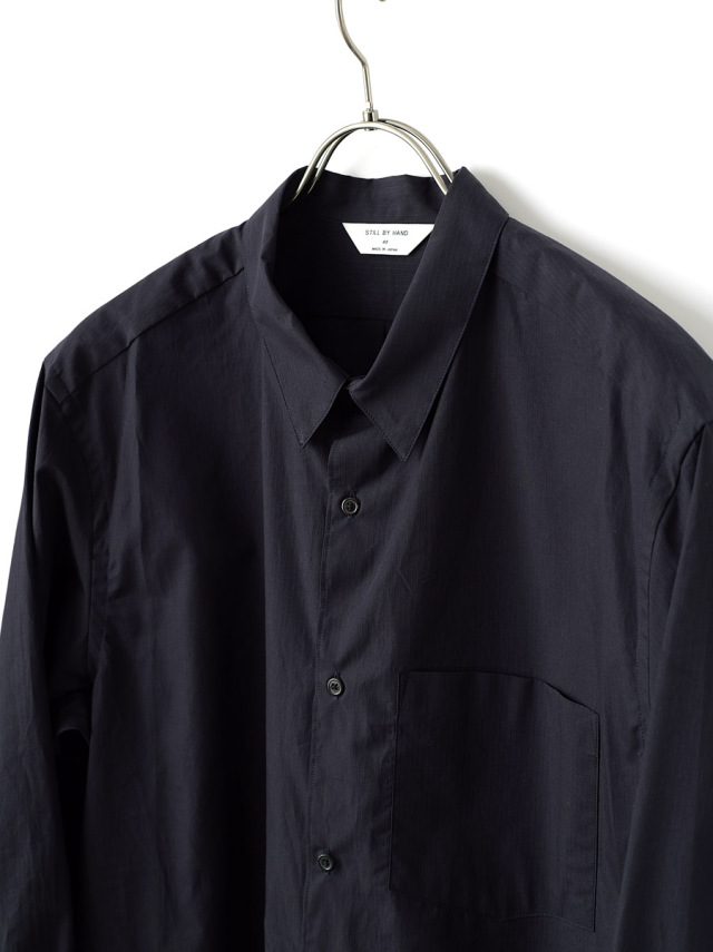 小襟でミニマルな印象、クリーンな雰囲気のシャツです。