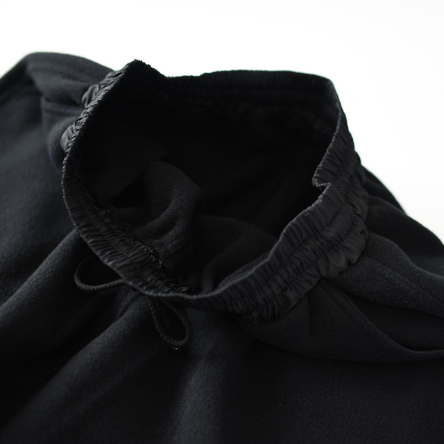 ウェストは別生地のチェーンステッチ、ゴム入り仕様で、ドローコード付き。